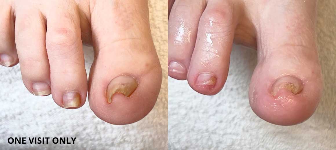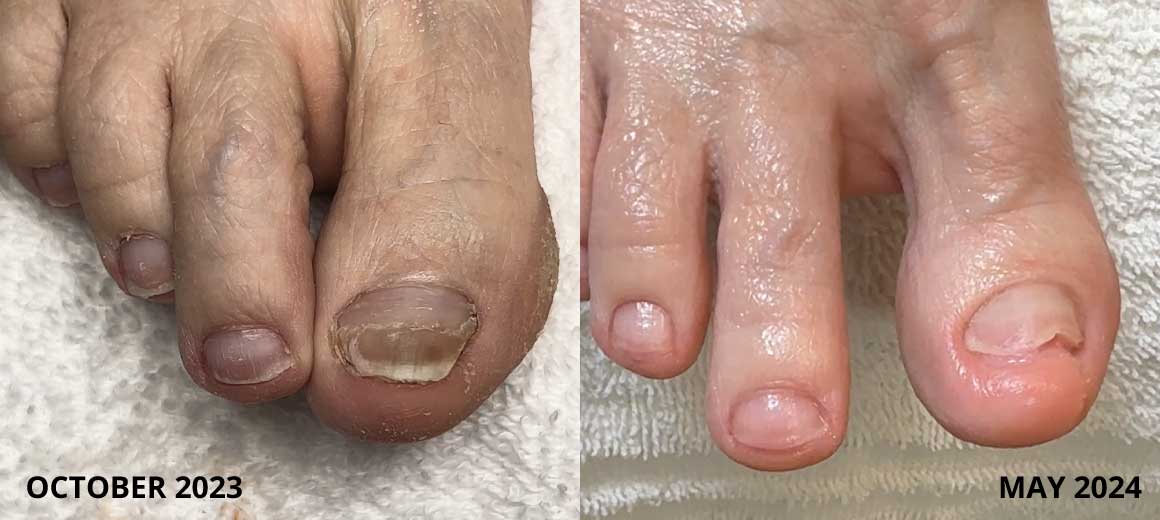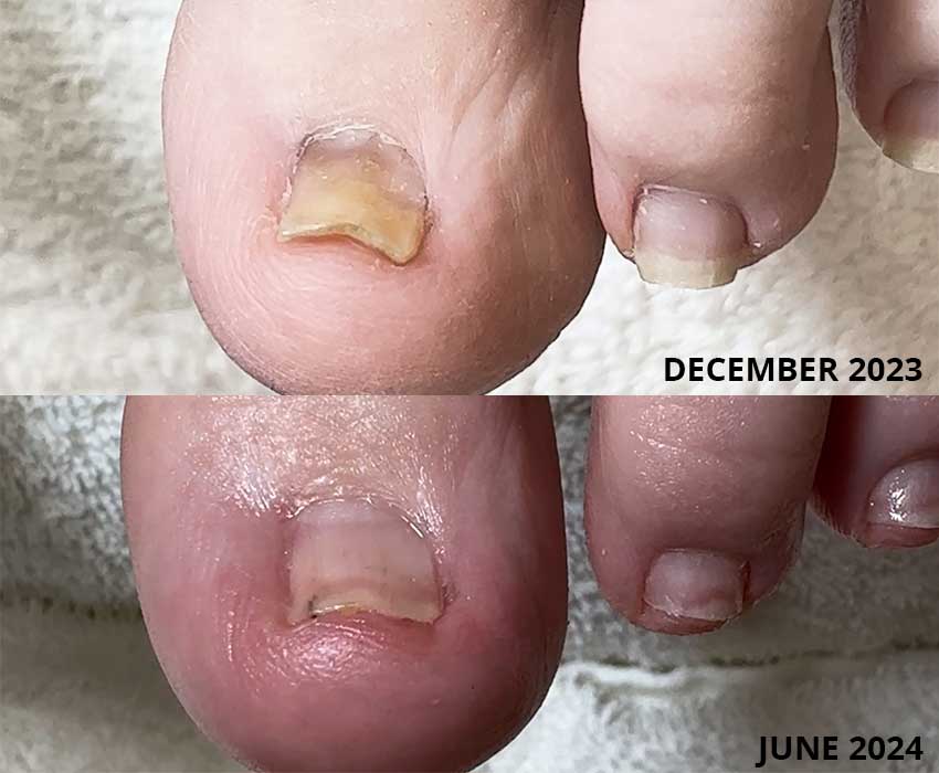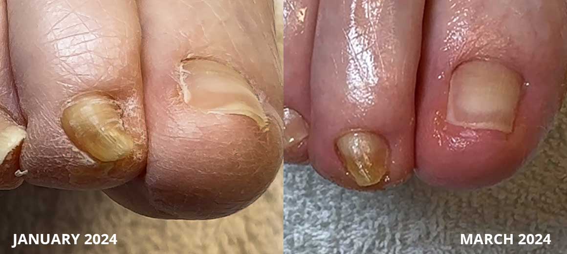 "My husband was dealing with discolored, thickening, curling, ingrown nails and lots of pain. I found your videos while trying to find a way to help with his pain. 2 years of doing your methods and the discoloration is gone. The nails are much thinner, the curling has almost reverted to normal, and he has almost zero pain. We still have one stubborn big toe that causes problems now and then, but we are still working on it. Thank you for your information and products! We will also watch your videos together."