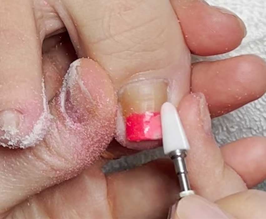 Reduce the thickness of thick nails by half. Clean away all build-up in the sidewalls, around the cuticle area, under the nail, and on the surface using pedicure steps provided by The Meticulous Manicurist Nail Tutorials on YouTube.