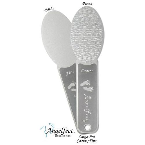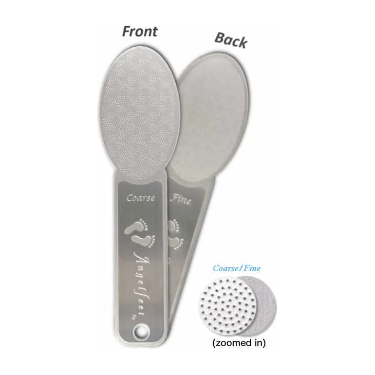 Angel Feet files are etched out of a single piece of surgical grade stainless steel, to create thousands of pyramids into a pattern to safely remove dry, cracked, and calloused skin. This technology makes the pedicure fast, safe, and easy to use, without cutting or grating the skin. Each file is double-sided. One side is rough for hard cracked and calloused skin and the other is for not so rough skin. You get the same Fine abrasive side with each file to accommodate softness.